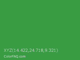XYZ 14.422,24.718,9.321 Color is a normal green color and the nearest color is May Green #4c9141. Hex code #399b43 and RGB value is rgb(57,155,67). In RGB color space, this color is composed of 22% red, 61% green, 26% blue, In CMYK color space, this color is composed of 63% cyan, 0% magenta, 57% yellow , 39% black , In HSL color space, this color has a hue angle of 126° , 46% saturation and 42% lightness.