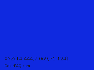 XYZ 14.444,7.069,71.124 Color is a normal blue color and the nearest color is Bluebonnet #1c1cf0. Hex code #0f29e0 and RGB value is rgb(15,41,224). In RGB color space, this color is composed of 6% red, 16% green, 88% blue, In CMYK color space, this color is composed of 93% cyan, 82% magenta, 0% yellow , 12% black , In HSL color space, this color has a hue angle of 233° , 87% saturation and 47% lightness.