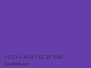 XYZ 14.44,9.152,39.534 Color is a normal violet color and the nearest color is Royal Purple #6b3fa0. Hex code #653eab and RGB value is rgb(101,62,171). In RGB color space, this color is composed of 40% red, 24% green, 67% blue, In CMYK color space, this color is composed of 41% cyan, 64% magenta, 0% yellow , 33% black , In HSL color space, this color has a hue angle of 261° , 47% saturation and 46% lightness.