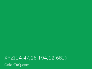 XYZ 14.47,26.194,12.681 Color is a normal green color and the nearest color is Green Pigment #00a550. Hex code #0aa154 and RGB value is rgb(10,161,84). In RGB color space, this color is composed of 4% red, 63% green, 33% blue, In CMYK color space, this color is composed of 94% cyan, 0% magenta, 48% yellow , 37% black , In HSL color space, this color has a hue angle of 149° , 88% saturation and 34% lightness.