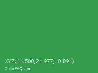 XYZ 14.508,24.977,10.894 Color is a normal green color and the nearest color is Sea Green #2e8b57. Hex code #329c4c and RGB value is rgb(50,156,76). In RGB color space, this color is composed of 20% red, 61% green, 30% blue, In CMYK color space, this color is composed of 68% cyan, 0% magenta, 51% yellow , 39% black , In HSL color space, this color has a hue angle of 135° , 51% saturation and 40% lightness.