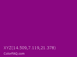 XYZ 14.509,7.119,21.378 Color is a dark magenta color and the nearest color is Mardi Gras #880085. Hex code #8a0681 and RGB value is rgb(138,6,129). In RGB color space, this color is composed of 54% red, 2% green, 51% blue, In CMYK color space, this color is composed of 0% cyan, 96% magenta, 7% yellow , 46% black , In HSL color space, this color has a hue angle of 304° , 92% saturation and 28% lightness.