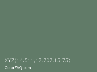 XYZ 14.511,17.707,15.75 Color is a normal green color and the nearest color is Glade Green #61845f. Hex code #617b68 and RGB value is rgb(97,123,104). In RGB color space, this color is composed of 38% red, 48% green, 41% blue, In CMYK color space, this color is composed of 21% cyan, 0% magenta, 15% yellow , 52% black , In HSL color space, this color has a hue angle of 136° , 12% saturation and 43% lightness.