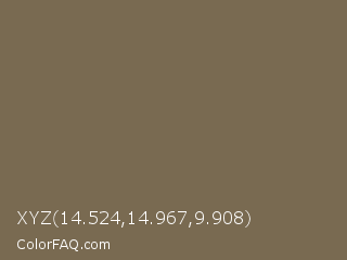 XYZ 14.524,14.967,9.908 Color is a normal orange color and the nearest color is Go Ben #726d4e. Hex code #796a51 and RGB value is rgb(121,106,81). In RGB color space, this color is composed of 47% red, 42% green, 32% blue, In CMYK color space, this color is composed of 0% cyan, 12% magenta, 33% yellow , 53% black , In HSL color space, this color has a hue angle of 38° , 20% saturation and 40% lightness.