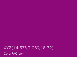 XYZ 14.533,7.239,18.72 Color is a dark magenta color and the nearest color is Mardi Gras #880085. Hex code #8d0979 and RGB value is rgb(141,9,121). In RGB color space, this color is composed of 55% red, 4% green, 47% blue, In CMYK color space, this color is composed of 0% cyan, 94% magenta, 14% yellow , 45% black , In HSL color space, this color has a hue angle of 309° , 88% saturation and 29% lightness.
