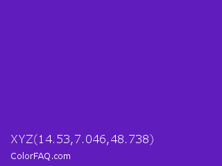 XYZ 14.53,7.046,48.738 Color is a normal violet color and the nearest color is Purple Heart Crayola #652dc1. Hex code #611cbd and RGB value is rgb(97,28,189). In RGB color space, this color is composed of 38% red, 11% green, 74% blue, In CMYK color space, this color is composed of 49% cyan, 85% magenta, 0% yellow , 26% black , In HSL color space, this color has a hue angle of 266° , 74% saturation and 43% lightness.
