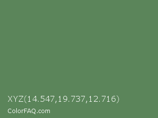 XYZ 14.547,19.737,12.716 Color is a normal green color and the nearest color is Glade Green #61845f. Hex code #5b855a and RGB value is rgb(91,133,90). In RGB color space, this color is composed of 36% red, 52% green, 35% blue, In CMYK color space, this color is composed of 32% cyan, 0% magenta, 32% yellow , 48% black , In HSL color space, this color has a hue angle of 119° , 19% saturation and 44% lightness.