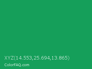 XYZ 14.553,25.694,13.865 Color is a normal green color and the nearest color is Shamrock Green #009e60. Hex code #159f5a and RGB value is rgb(21,159,90). In RGB color space, this color is composed of 8% red, 62% green, 35% blue, In CMYK color space, this color is composed of 87% cyan, 0% magenta, 43% yellow , 38% black , In HSL color space, this color has a hue angle of 150° , 77% saturation and 35% lightness.