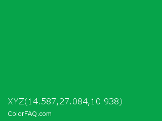 XYZ 14.587,27.084,10.938 Color is a normal green color and the nearest color is Green Pigment #00a550. Hex code #06a44a and RGB value is rgb(6,164,74). In RGB color space, this color is composed of 2% red, 64% green, 29% blue, In CMYK color space, this color is composed of 96% cyan, 0% magenta, 55% yellow , 36% black , In HSL color space, this color has a hue angle of 146° , 93% saturation and 33% lightness.