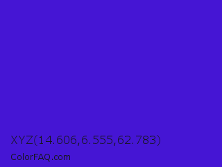 XYZ 14.606,6.555,62.783 Color is a normal indigo color and the nearest color is Interdimensional Blue #360ccc. Hex code #4515d4 and RGB value is rgb(69,21,212). In RGB color space, this color is composed of 27% red, 8% green, 83% blue, In CMYK color space, this color is composed of 67% cyan, 90% magenta, 0% yellow , 17% black , In HSL color space, this color has a hue angle of 255° , 82% saturation and 46% lightness.