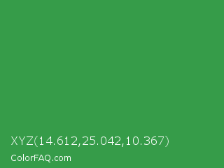 XYZ 14.612,25.042,10.367 Color is a normal green color and the nearest color is Sea Green #2e8b57. Hex code #369c49 and RGB value is rgb(54,156,73). In RGB color space, this color is composed of 21% red, 61% green, 29% blue, In CMYK color space, this color is composed of 65% cyan, 0% magenta, 53% yellow , 39% black , In HSL color space, this color has a hue angle of 131° , 49% saturation and 41% lightness.