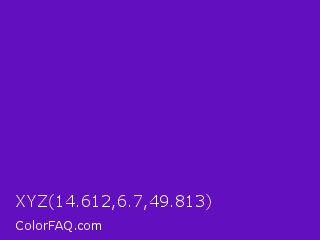 XYZ 14.612,6.7,49.813 Color is a normal violet color and the nearest color is Purple Heart Crayola #652dc1. Hex code #620fbf and RGB value is rgb(98,15,191). In RGB color space, this color is composed of 38% red, 6% green, 75% blue, In CMYK color space, this color is composed of 49% cyan, 92% magenta, 0% yellow , 25% black , In HSL color space, this color has a hue angle of 268° , 85% saturation and 40% lightness.