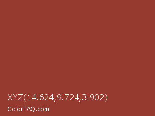 XYZ 14.624,9.724,3.902 Color is a normal red color and the nearest color is El Salva #8f3e33. Hex code #963a30 and RGB value is rgb(150,58,48). In RGB color space, this color is composed of 59% red, 23% green, 19% blue, In CMYK color space, this color is composed of 0% cyan, 61% magenta, 68% yellow , 41% black , In HSL color space, this color has a hue angle of 6° , 52% saturation and 39% lightness.