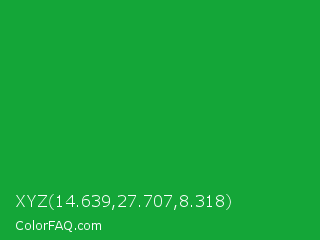 XYZ 14.639,27.707,8.318 Color is a normal green color and the nearest color is Green Pantone #00ad43. Hex code #14a638 and RGB value is rgb(20,166,56). In RGB color space, this color is composed of 8% red, 65% green, 22% blue, In CMYK color space, this color is composed of 88% cyan, 0% magenta, 66% yellow , 35% black , In HSL color space, this color has a hue angle of 135° , 78% saturation and 36% lightness.