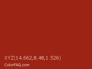 XYZ 14.662,8.48,1.526 Color is a normal red color and the nearest color is Tabasco #a02712. Hex code #9d2414 and RGB value is rgb(157,36,20). In RGB color space, this color is composed of 62% red, 14% green, 8% blue, In CMYK color space, this color is composed of 0% cyan, 77% magenta, 87% yellow , 38% black , In HSL color space, this color has a hue angle of 7° , 77% saturation and 35% lightness.