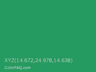 XYZ 14.672,24.978,14.638 Color is a normal green color and the nearest color is Eucalyptus #278a5b. Hex code #259c5e and RGB value is rgb(37,156,94). In RGB color space, this color is composed of 15% red, 61% green, 37% blue, In CMYK color space, this color is composed of 76% cyan, 0% magenta, 40% yellow , 39% black , In HSL color space, this color has a hue angle of 149° , 62% saturation and 38% lightness.