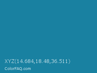 XYZ 14.684,18.48,36.511 Color is a normal blue color and the nearest color is Jelly Bean #297b9a. Hex code #1981a1 and RGB value is rgb(25,129,161). In RGB color space, this color is composed of 10% red, 51% green, 63% blue, In CMYK color space, this color is composed of 84% cyan, 20% magenta, 0% yellow , 37% black , In HSL color space, this color has a hue angle of 194° , 73% saturation and 36% lightness.