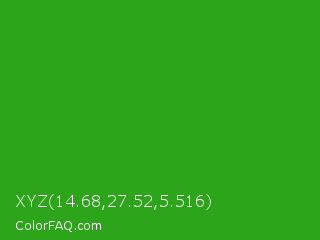 XYZ 14.68,27.52,5.516 Color is a normal green color and the nearest color is Slimy Green #299617. Hex code #2ca51a and RGB value is rgb(44,165,26). In RGB color space, this color is composed of 17% red, 65% green, 10% blue, In CMYK color space, this color is composed of 73% cyan, 0% magenta, 84% yellow , 35% black , In HSL color space, this color has a hue angle of 112° , 73% saturation and 37% lightness.