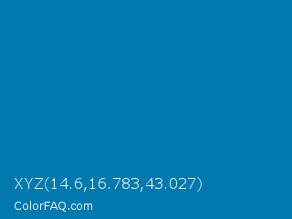 XYZ 14.6,16.783,43.027 Color is a normal blue color and the nearest color is Deep Cerulean #007ba7. Hex code #0279af and RGB value is rgb(2,121,175). In RGB color space, this color is composed of 1% red, 47% green, 69% blue, In CMYK color space, this color is composed of 99% cyan, 31% magenta, 0% yellow , 31% black , In HSL color space, this color has a hue angle of 199° , 98% saturation and 35% lightness.