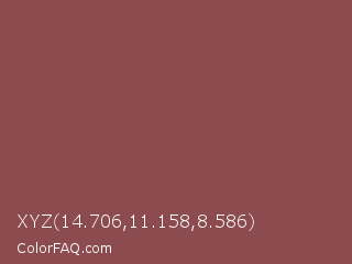 XYZ 14.706,11.158,8.586 Color is a normal red color and the nearest color is Copper Rust #944747. Hex code #8c4b4e and RGB value is rgb(140,75,78). In RGB color space, this color is composed of 55% red, 29% green, 31% blue, In CMYK color space, this color is composed of 0% cyan, 46% magenta, 44% yellow , 45% black , In HSL color space, this color has a hue angle of 357° , 30% saturation and 42% lightness.