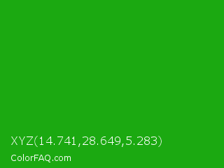 XYZ 14.741,28.649,5.283 Color is a normal green color and the nearest color is Slimy Green #299617. Hex code #1ba911 and RGB value is rgb(27,169,17). In RGB color space, this color is composed of 11% red, 66% green, 7% blue, In CMYK color space, this color is composed of 84% cyan, 0% magenta, 90% yellow , 34% black , In HSL color space, this color has a hue angle of 116° , 82% saturation and 36% lightness.