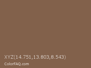 XYZ 14.751,13.803,8.543 Color is a normal orange color and the nearest color is Dark Brown Tangelo #88654e. Hex code #82614b and RGB value is rgb(130,97,75). In RGB color space, this color is composed of 51% red, 38% green, 29% blue, In CMYK color space, this color is composed of 0% cyan, 25% magenta, 42% yellow , 49% black , In HSL color space, this color has a hue angle of 24° , 27% saturation and 40% lightness.