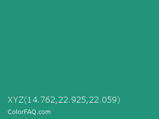 XYZ 14.762,22.925,22.059 Color is a normal cyan color and the nearest color is Illuminating Emerald #319177. Hex code #22947a and RGB value is rgb(34,148,122). In RGB color space, this color is composed of 13% red, 58% green, 48% blue, In CMYK color space, this color is composed of 77% cyan, 0% magenta, 18% yellow , 42% black , In HSL color space, this color has a hue angle of 166° , 63% saturation and 36% lightness.
