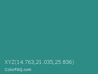 XYZ 14.763,21.035,25.836 Color is a normal cyan color and the nearest color is Lochinvar #2c8c84. Hex code #2d8c86 and RGB value is rgb(45,140,134). In RGB color space, this color is composed of 18% red, 55% green, 53% blue, In CMYK color space, this color is composed of 68% cyan, 0% magenta, 4% yellow , 45% black , In HSL color space, this color has a hue angle of 176° , 51% saturation and 36% lightness.
