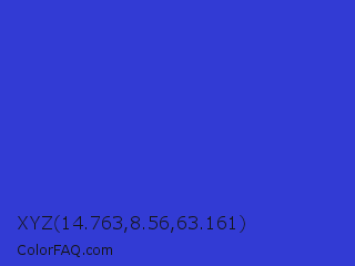 XYZ 14.763,8.56,63.161 Color is a normal blue color and the nearest color is Palatinate Blue #273be2. Hex code #323bd4 and RGB value is rgb(50,59,212). In RGB color space, this color is composed of 20% red, 23% green, 83% blue, In CMYK color space, this color is composed of 76% cyan, 72% magenta, 0% yellow , 17% black , In HSL color space, this color has a hue angle of 237° , 65% saturation and 51% lightness.