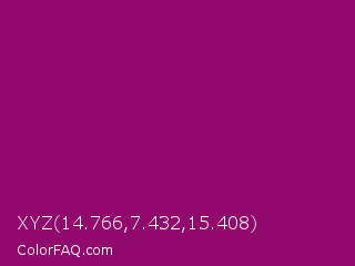 XYZ 14.766,7.432,15.408 Color is a dark magenta color and the nearest color is Fresh Eggplant #990066. Hex code #92096e and RGB value is rgb(146,9,110). In RGB color space, this color is composed of 57% red, 4% green, 43% blue, In CMYK color space, this color is composed of 0% cyan, 94% magenta, 25% yellow , 43% black , In HSL color space, this color has a hue angle of 316° , 88% saturation and 30% lightness.