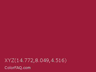 XYZ 14.772,8.049,4.516 Color is a normal red color and the nearest color is Vivid Burgundy #9f1d35. Hex code #9c1938 and RGB value is rgb(156,25,56). In RGB color space, this color is composed of 61% red, 10% green, 22% blue, In CMYK color space, this color is composed of 0% cyan, 84% magenta, 64% yellow , 39% black , In HSL color space, this color has a hue angle of 346° , 72% saturation and 35% lightness.