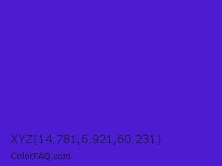 XYZ 14.781,6.921,60.231 Color is a normal indigo color and the nearest color is Interdimensional Blue #360ccc. Hex code #4c1cd0 and RGB value is rgb(76,28,208). In RGB color space, this color is composed of 30% red, 11% green, 82% blue, In CMYK color space, this color is composed of 63% cyan, 87% magenta, 0% yellow , 18% black , In HSL color space, this color has a hue angle of 256° , 76% saturation and 46% lightness.