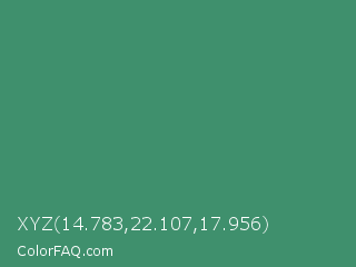XYZ 14.783,22.107,17.956 Color is a normal green color and the nearest color is Viridian #40826d. Hex code #3f906d and RGB value is rgb(63,144,109). In RGB color space, this color is composed of 25% red, 56% green, 43% blue, In CMYK color space, this color is composed of 56% cyan, 0% magenta, 24% yellow , 44% black , In HSL color space, this color has a hue angle of 154° , 39% saturation and 41% lightness.