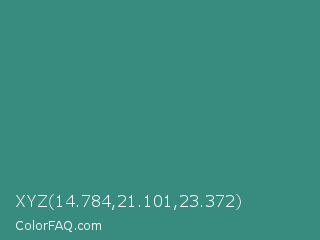 XYZ 14.784,21.101,23.372 Color is a normal cyan color and the nearest color is Illuminating Emerald #319177. Hex code #378c7f and RGB value is rgb(55,140,127). In RGB color space, this color is composed of 22% red, 55% green, 50% blue, In CMYK color space, this color is composed of 61% cyan, 0% magenta, 9% yellow , 45% black , In HSL color space, this color has a hue angle of 171° , 44% saturation and 38% lightness.