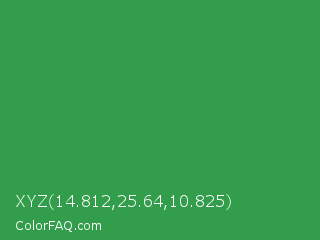 XYZ 14.812,25.64,10.825 Color is a normal green color and the nearest color is Sea Green #2e8b57. Hex code #329e4b and RGB value is rgb(50,158,75). In RGB color space, this color is composed of 20% red, 62% green, 29% blue, In CMYK color space, this color is composed of 68% cyan, 0% magenta, 53% yellow , 38% black , In HSL color space, this color has a hue angle of 134° , 52% saturation and 41% lightness.