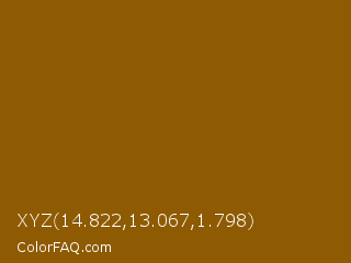 XYZ 14.822,13.067,1.798 Color is a dark orange color and the nearest color is Rusty Nail #86560a. Hex code #8e5a02 and RGB value is rgb(142,90,2). In RGB color space, this color is composed of 56% red, 35% green, 1% blue, In CMYK color space, this color is composed of 0% cyan, 37% magenta, 99% yellow , 44% black , In HSL color space, this color has a hue angle of 38° , 97% saturation and 28% lightness.