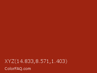 XYZ 14.833,8.571,1.403 Color is a normal red color and the nearest color is Tabasco #a02712. Hex code #9e2411 and RGB value is rgb(158,36,17). In RGB color space, this color is composed of 62% red, 14% green, 7% blue, In CMYK color space, this color is composed of 0% cyan, 77% magenta, 89% yellow , 38% black , In HSL color space, this color has a hue angle of 8° , 81% saturation and 34% lightness.