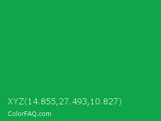 XYZ 14.855,27.493,10.827 Color is a normal green color and the nearest color is Green Pigment #00a550. Hex code #0fa549 and RGB value is rgb(15,165,73). In RGB color space, this color is composed of 6% red, 65% green, 29% blue, In CMYK color space, this color is composed of 91% cyan, 0% magenta, 56% yellow , 35% black , In HSL color space, this color has a hue angle of 143° , 83% saturation and 35% lightness.