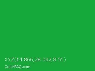 XYZ 14.866,28.092,8.51 Color is a normal green color and the nearest color is Green Pantone #00ad43. Hex code #15a739 and RGB value is rgb(21,167,57). In RGB color space, this color is composed of 8% red, 65% green, 22% blue, In CMYK color space, this color is composed of 87% cyan, 0% magenta, 66% yellow , 35% black , In HSL color space, this color has a hue angle of 135° , 78% saturation and 37% lightness.