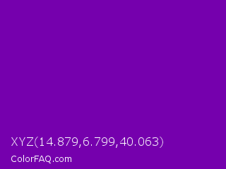 XYZ 14.879,6.799,40.063 Color is a normal purple color and the nearest color is Violet RYB #8601af. Hex code #7500ad and RGB value is rgb(117,0,173). In RGB color space, this color is composed of 46% red, 0% green, 68% blue, In CMYK color space, this color is composed of 32% cyan, 100% magenta, 0% yellow , 32% black , In HSL color space, this color has a hue angle of 281° , 100% saturation and 34% lightness.