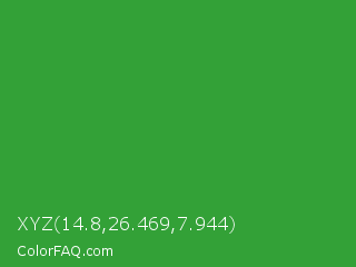 XYZ 14.8,26.469,7.944 Color is a normal green color and the nearest color is Wageningen Green #34b233. Hex code #33a137 and RGB value is rgb(51,161,55). In RGB color space, this color is composed of 20% red, 63% green, 22% blue, In CMYK color space, this color is composed of 68% cyan, 0% magenta, 66% yellow , 37% black , In HSL color space, this color has a hue angle of 122° , 52% saturation and 42% lightness.