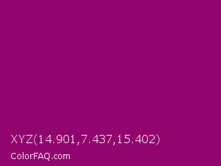 XYZ 14.901,7.437,15.402 Color is a dark magenta color and the nearest color is Fresh Eggplant #990066. Hex code #93056e and RGB value is rgb(147,5,110). In RGB color space, this color is composed of 58% red, 2% green, 43% blue, In CMYK color space, this color is composed of 0% cyan, 97% magenta, 25% yellow , 42% black , In HSL color space, this color has a hue angle of 316° , 93% saturation and 30% lightness.