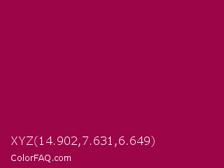 XYZ 14.902,7.631,6.649 Color is a normal rose color and the nearest color is Pink Raspberry #980036. Hex code #9c0547 and RGB value is rgb(156,5,71). In RGB color space, this color is composed of 61% red, 2% green, 28% blue, In CMYK color space, this color is composed of 0% cyan, 97% magenta, 54% yellow , 39% black , In HSL color space, this color has a hue angle of 334° , 94% saturation and 32% lightness.