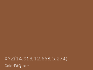 XYZ 14.913,12.668,5.274 Color is a normal orange color and the nearest color is Potters Clay #8c5738. Hex code #8c5737 and RGB value is rgb(140,87,55). In RGB color space, this color is composed of 55% red, 34% green, 22% blue, In CMYK color space, this color is composed of 0% cyan, 38% magenta, 61% yellow , 45% black , In HSL color space, this color has a hue angle of 23° , 44% saturation and 38% lightness.