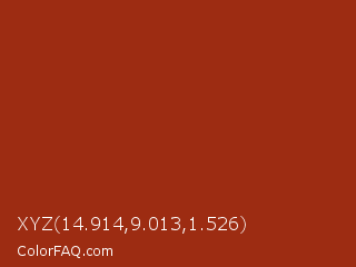 XYZ 14.914,9.013,1.526 Color is a normal red color and the nearest color is Tabasco #a02712. Hex code #9d2c12 and RGB value is rgb(157,44,18). In RGB color space, this color is composed of 62% red, 17% green, 7% blue, In CMYK color space, this color is composed of 0% cyan, 72% magenta, 89% yellow , 38% black , In HSL color space, this color has a hue angle of 11° , 79% saturation and 34% lightness.