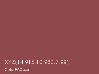 XYZ 14.915,10.982,7.99 Color is a normal red color and the nearest color is Copper Rust #944747. Hex code #8f484b and RGB value is rgb(143,72,75). In RGB color space, this color is composed of 56% red, 28% green, 29% blue, In CMYK color space, this color is composed of 0% cyan, 50% magenta, 48% yellow , 44% black , In HSL color space, this color has a hue angle of 357° , 33% saturation and 42% lightness.