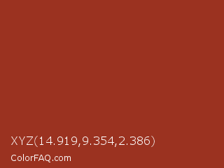 XYZ 14.919,9.354,2.386 Color is a normal red color and the nearest color is Prairie Sand #9a3820. Hex code #9b3220 and RGB value is rgb(155,50,32). In RGB color space, this color is composed of 61% red, 20% green, 13% blue, In CMYK color space, this color is composed of 0% cyan, 68% magenta, 79% yellow , 39% black , In HSL color space, this color has a hue angle of 9° , 66% saturation and 37% lightness.