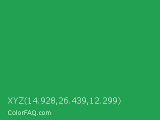 XYZ 14.928,26.439,12.299 Color is a normal green color and the nearest color is Eucalyptus #278a5b. Hex code #22a152 and RGB value is rgb(34,161,82). In RGB color space, this color is composed of 13% red, 63% green, 32% blue, In CMYK color space, this color is composed of 79% cyan, 0% magenta, 49% yellow , 37% black , In HSL color space, this color has a hue angle of 143° , 65% saturation and 38% lightness.