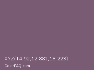 XYZ 14.92,12.881,18.223 Color is a normal magenta color and the nearest color is Falcon #7f626d. Hex code #7a5b74 and RGB value is rgb(122,91,116). In RGB color space, this color is composed of 48% red, 36% green, 45% blue, In CMYK color space, this color is composed of 0% cyan, 25% magenta, 5% yellow , 52% black , In HSL color space, this color has a hue angle of 312° , 15% saturation and 42% lightness.