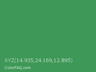 XYZ 14.935,24.169,12.895 Color is a normal green color and the nearest color is Chateau Green #40a860. Hex code #3e9857 and RGB value is rgb(62,152,87). In RGB color space, this color is composed of 24% red, 60% green, 34% blue, In CMYK color space, this color is composed of 59% cyan, 0% magenta, 43% yellow , 40% black , In HSL color space, this color has a hue angle of 137° , 42% saturation and 42% lightness.